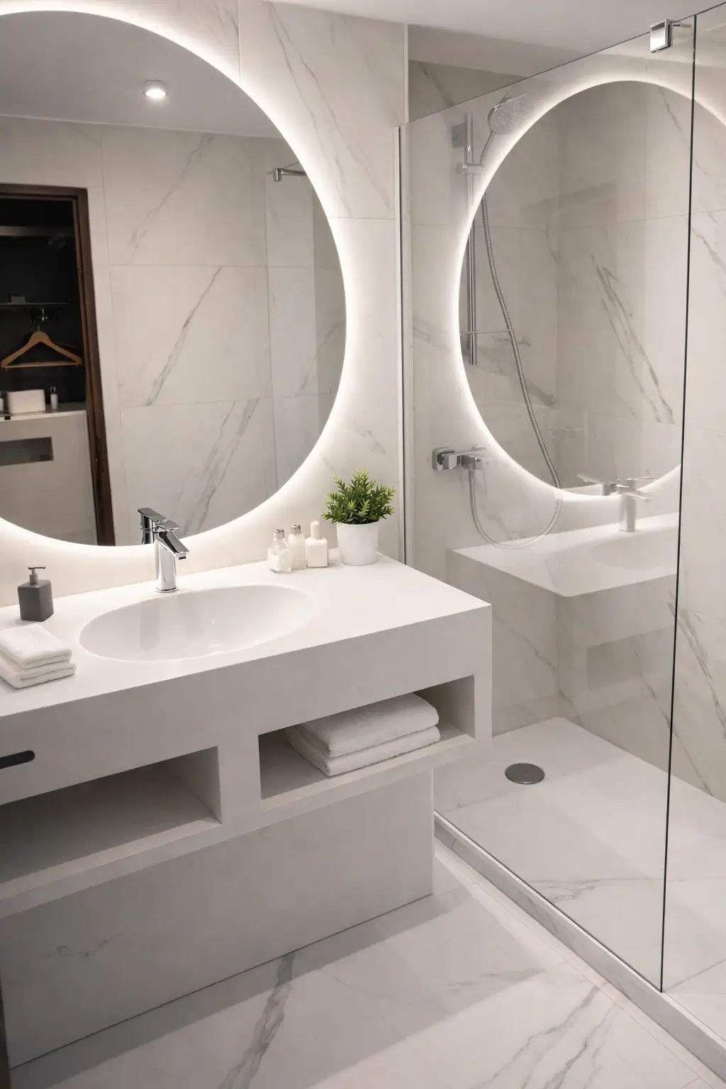 Chaque espace a été conçu pour allier fonctionnalité, esthétisme et durabilité. Les matériaux, les couleurs et les finitions ont été sélectionnés avec soin afin de créer une atmosphère chaleureuse, raffinée et intemporelle. Les salles de bains ont fait l’objet d’une attention particulière, avec une optimisation des volumes, une mise en valeur des lignes architecturales et l’intégration d’équipements modernes favorisant le confort et la praticité.